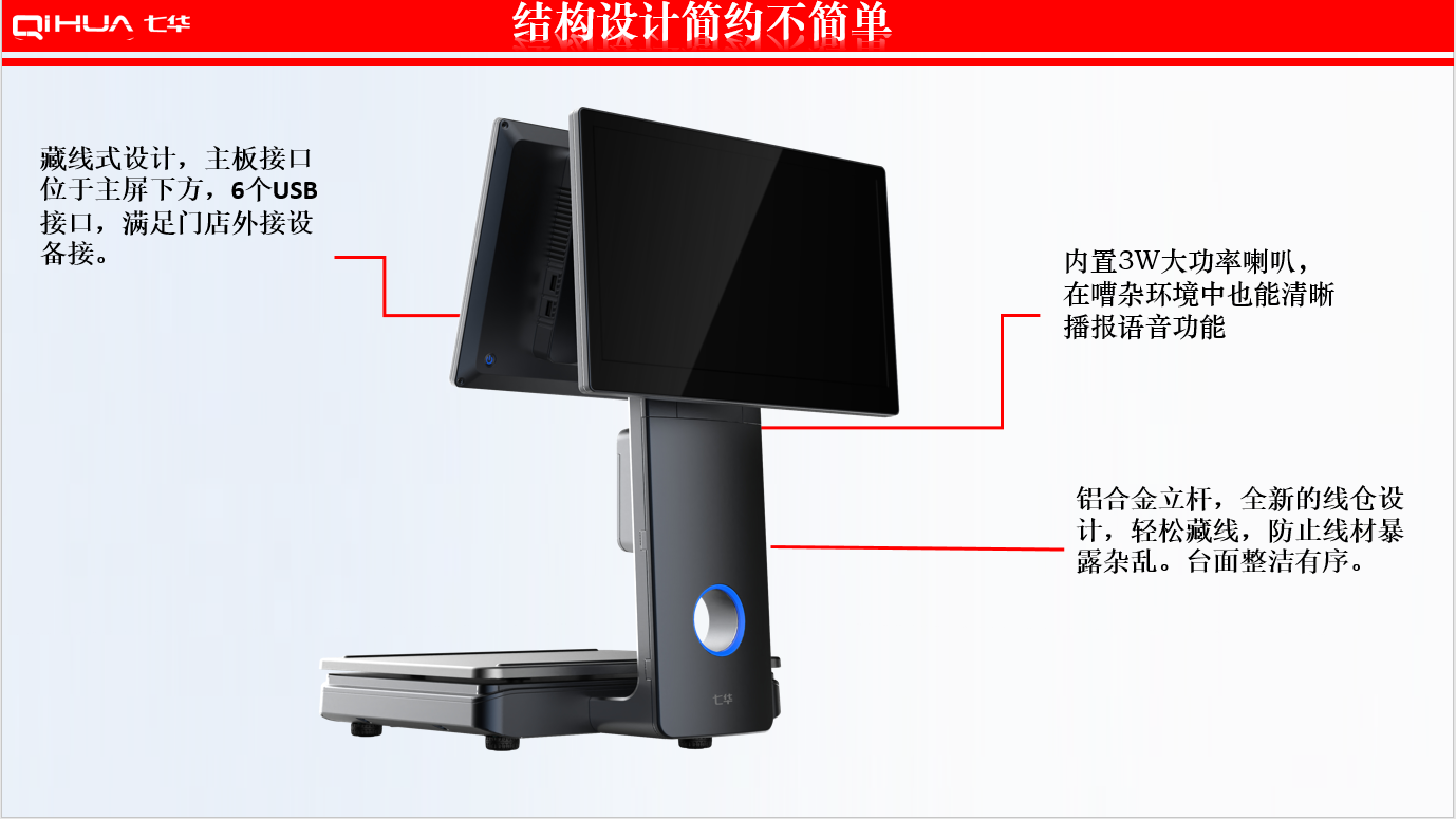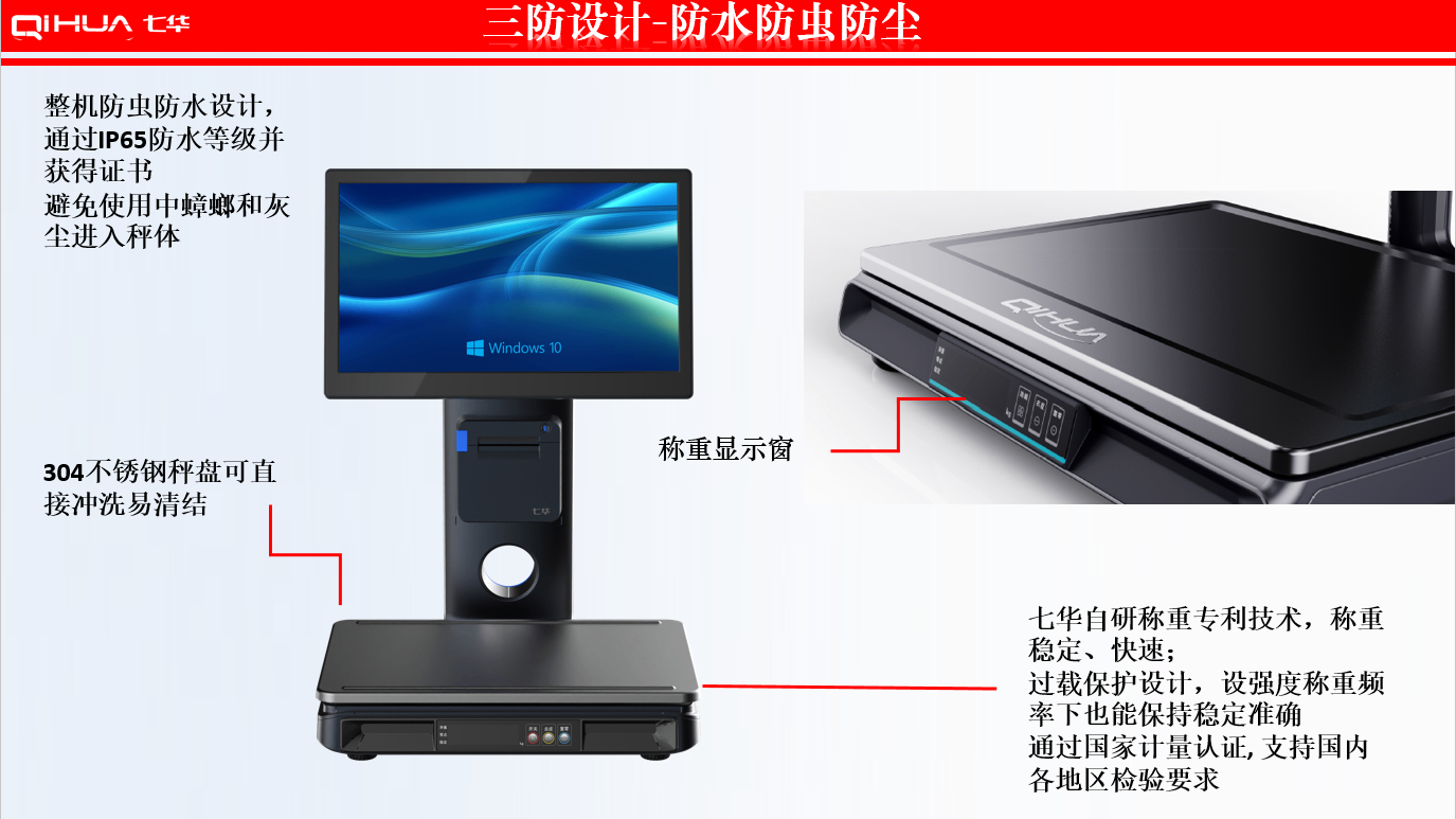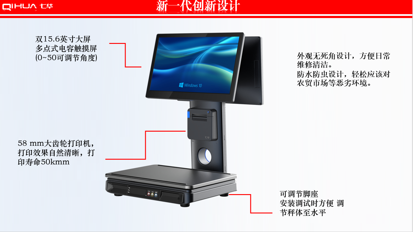 描述:新一代創(chuàng)新設(shè)計(jì),雙15.6英寸大屏,多點(diǎn)式電容觸摸屏可(0~50可調(diào)節(jié)角度)。鋁合金立桿,全新的線(xiàn)倉(cāng)設(shè)計(jì),輕松藏線(xiàn),防止線(xiàn)材暴露雜亂。臺(tái)面整潔有序。七華自研稱(chēng)重專(zhuān)利技術(shù),稱(chēng)重穩(wěn)定、快速;過(guò)載保護(hù)設(shè)計(jì),設(shè)強(qiáng)度稱(chēng)重頻率下也能保持穩(wěn)定準(zhǔn)確;通過(guò)國(guó)家計(jì)量認(rèn)證, 支持國(guó)內(nèi)各地區(qū)檢驗(yàn)要求。外觀無(wú)死角設(shè)計(jì),方便日常維修清潔。 防水防蟲(chóng)設(shè)計(jì),輕松應(yīng)該對(duì)農(nóng)貿(mào)市場(chǎng)等惡劣環(huán)境。